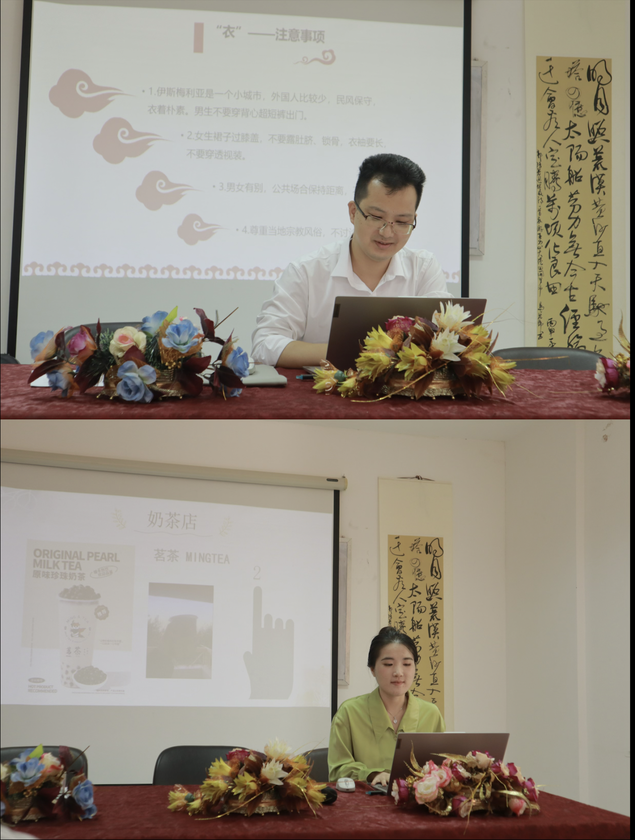 作为阿语培训班的任课教师,澳萨玛教授则向同学们介绍了培训期间大致的课程安排,表示每周四的活动日会给同学们教授阿语书法、戏剧、诗歌等,让同学们体验阿拉伯文化的魅力。