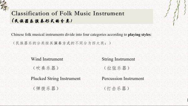 本视频由中国政法大学人文学院何梦叶老师主讲,何老师毕业于中央音乐学院,主修二胡演奏,曾赴美国、日本、新加坡等国参与文化交流,于2017年、2019年举办专场音乐会,并带领学校艺术团访问罗马尼亚布加勒斯特大学孔子学院,拥有深厚的民族器乐造诣与丰富的文化传播经验。 中华五千年文明孕育了博大精深的民族文化,民族器乐作为其中的重要载体,不仅承载着独特的艺术价值,更凝聚着中华民族的审美情趣与精神内核,融合了各民族的人文特质,既可独奏传情,亦可作为曲艺、戏曲等艺术形式的伴奏,彰显多元艺术魅力。 视频中,何老师系统讲解了自秦代以来民族器乐的四大分类——吹奏乐器、拉弦乐器、弹拨乐器与打击乐器,逐一介绍各类乐器的发声原理、代表乐器及艺术特色:详解笛子的分类与音色差异,演绎二胡跨越千年的表现力与多元曲风,解读琵琶的历史渊源与精湛技法,介绍打击乐器的音色特点与应用场景。 视频穿插《月光爱人》《赛马》《十面埋伏》《彩云追月》等经典曲目片段,搭配中国广播民族乐团等专业演奏呈现,让观众在听觉享受中直观感受民族器乐的独特韵味。本次分享旨在传播民族器乐文化,增进大众对中国传统音乐的了解与喜爱,搭建文化交流的桥梁,诚邀各位共赏中华传统音乐之美。